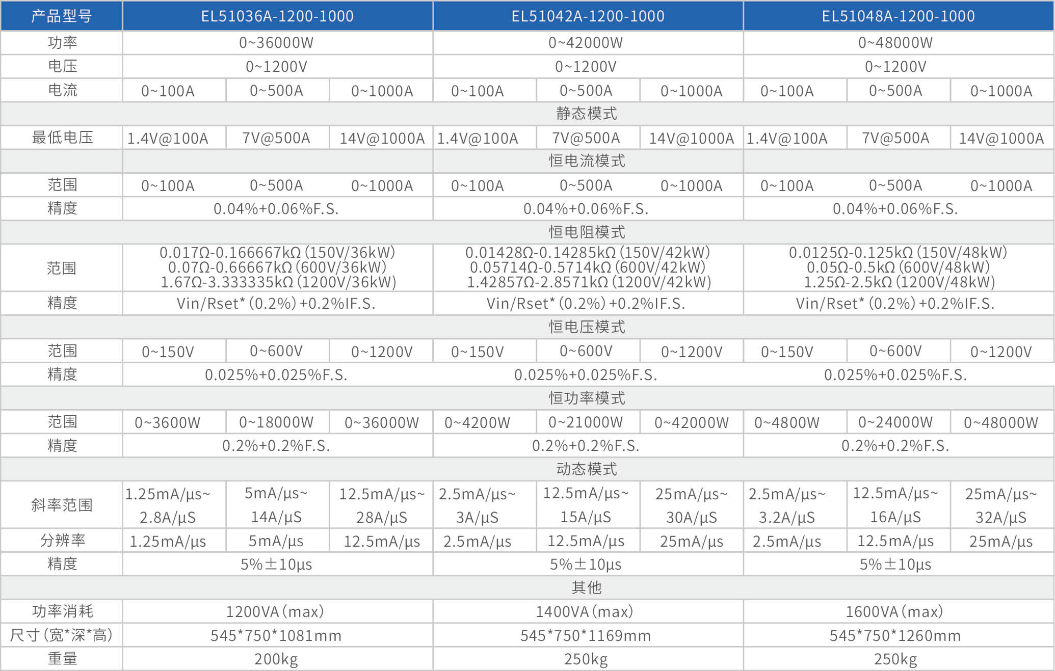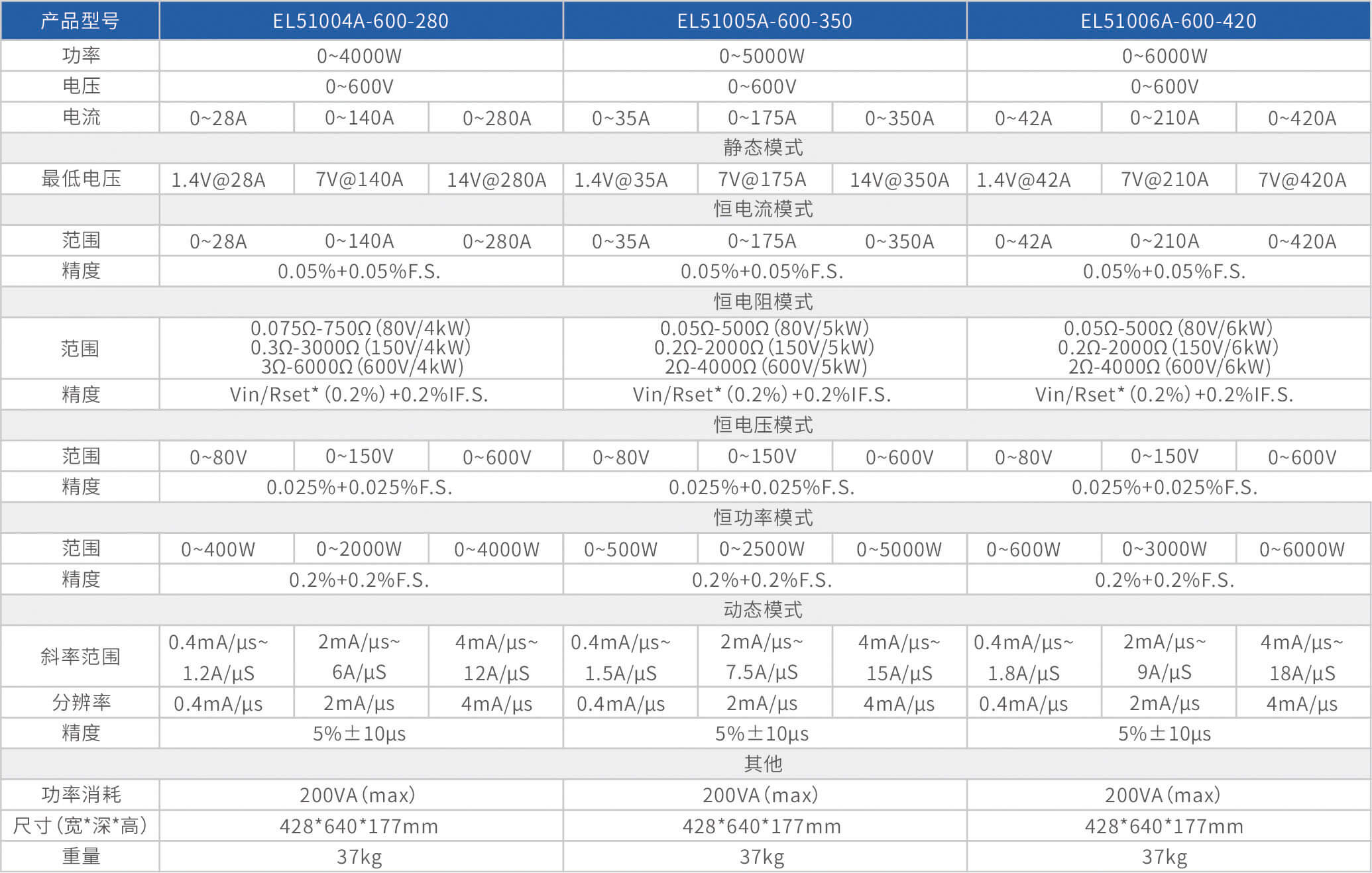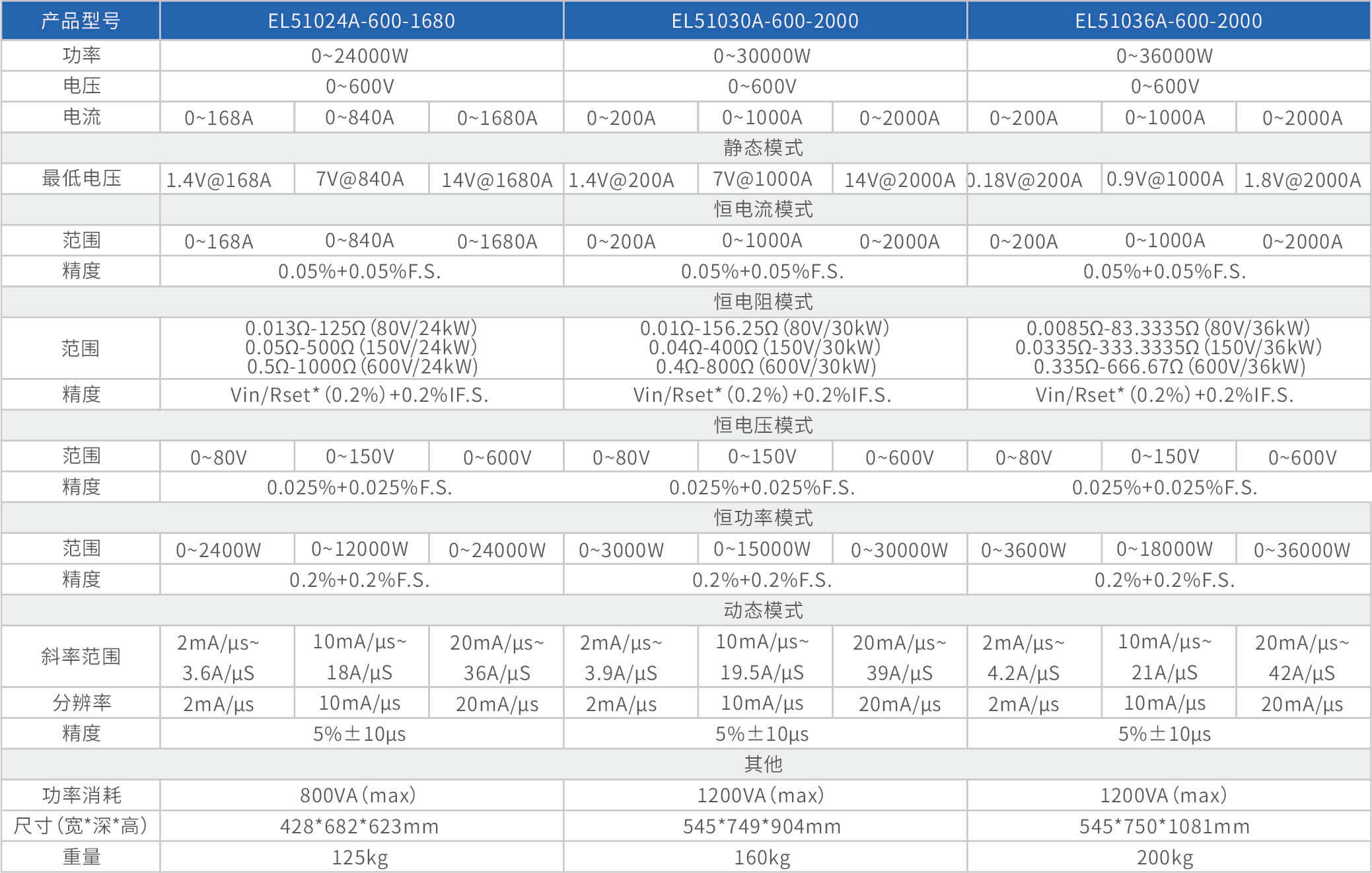 高精度電子負載EL51000A系列,有150V、600V、1200V三種電壓范圍,功率范圍由2kW至48kW,單一臺的最大電流可達2000A;通過并聯(lián)擴展,最大功率更可達480kW。EL51000A系列負載具有高功率密度、高控制和測量精度、高性價的特點;同時本系列負載具備同步動態(tài),并聯(lián)擴展等功能,以及瞬間提供三倍額定功率功能,支持恒電壓CV、恒電流CC、恒電阻CR、恒功率CP四種傳統(tǒng)靜態(tài)加載模式,以及CV+ CC、CR+CC、CV+ CR三種復(fù)合加載模式。