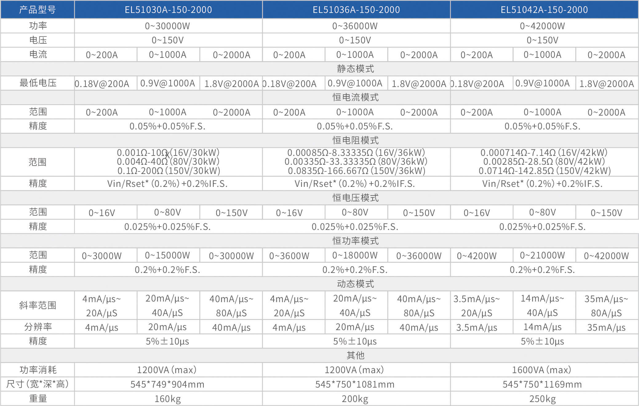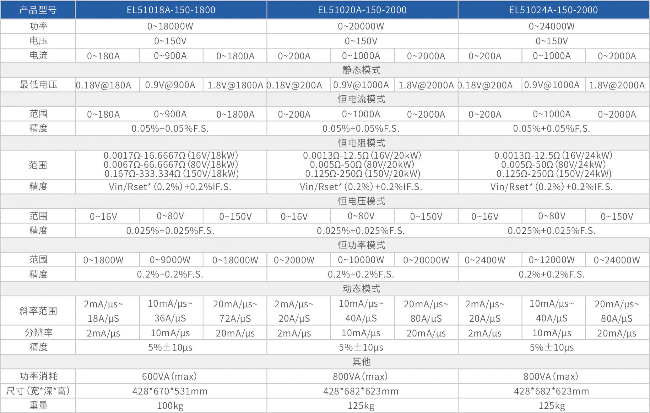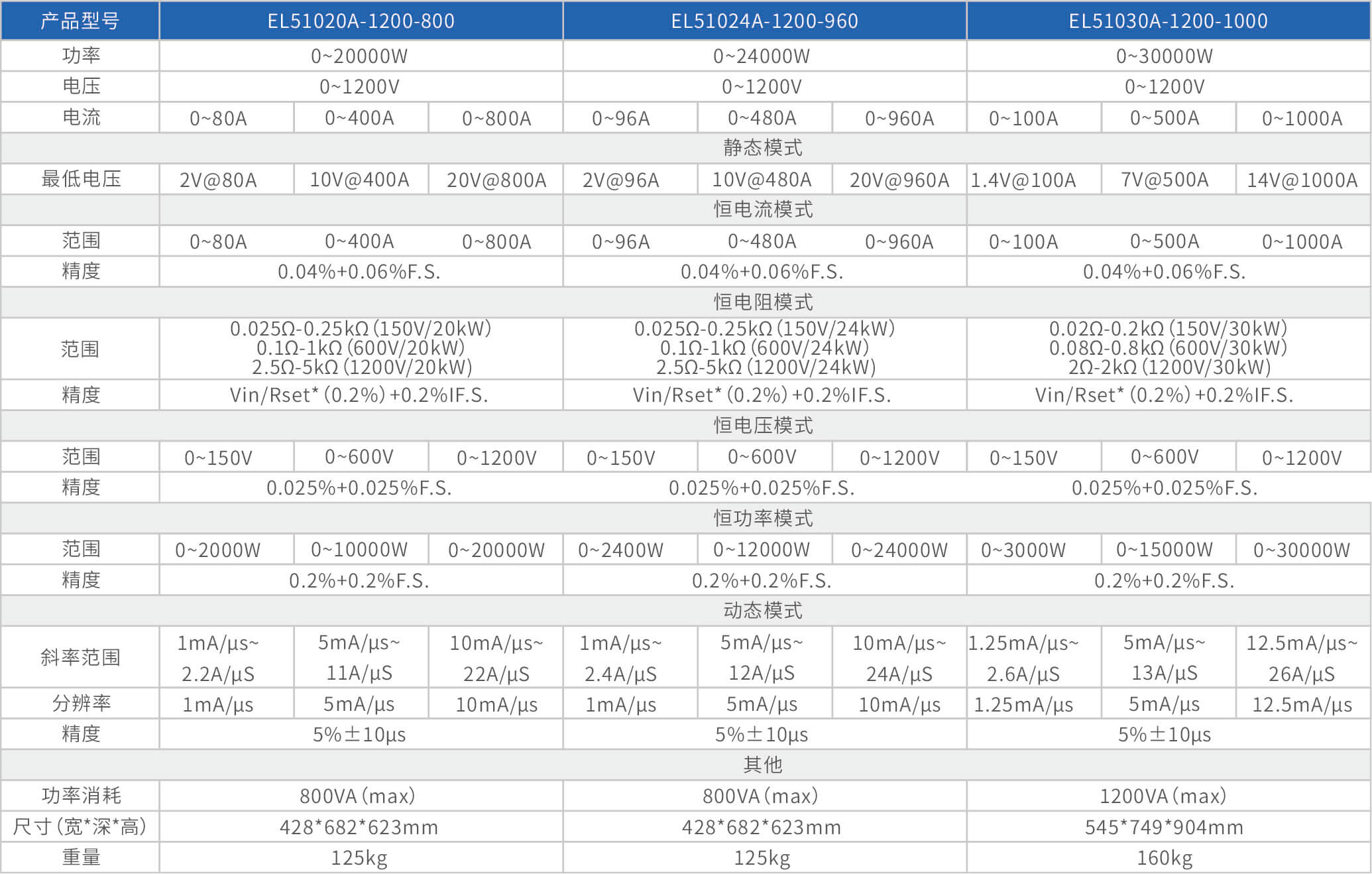 高精度電子負載EL51000A系列,有150V、600V、1200V三種電壓范圍,功率范圍由2kW至48kW,單一臺的最大電流可達2000A;通過并聯(lián)擴展,最大功率更可達480kW。EL51000A系列負載具有高功率密度、高控制和測量精度、高性價的特點;同時本系列負載具備同步動態(tài),并聯(lián)擴展等功能,以及瞬間提供三倍額定功率功能,支持恒電壓CV、恒電流CC、恒電阻CR、恒功率CP四種傳統(tǒng)靜態(tài)加載模式,以及CV+ CC、CR+CC、CV+ CR三種復(fù)合加載模式。