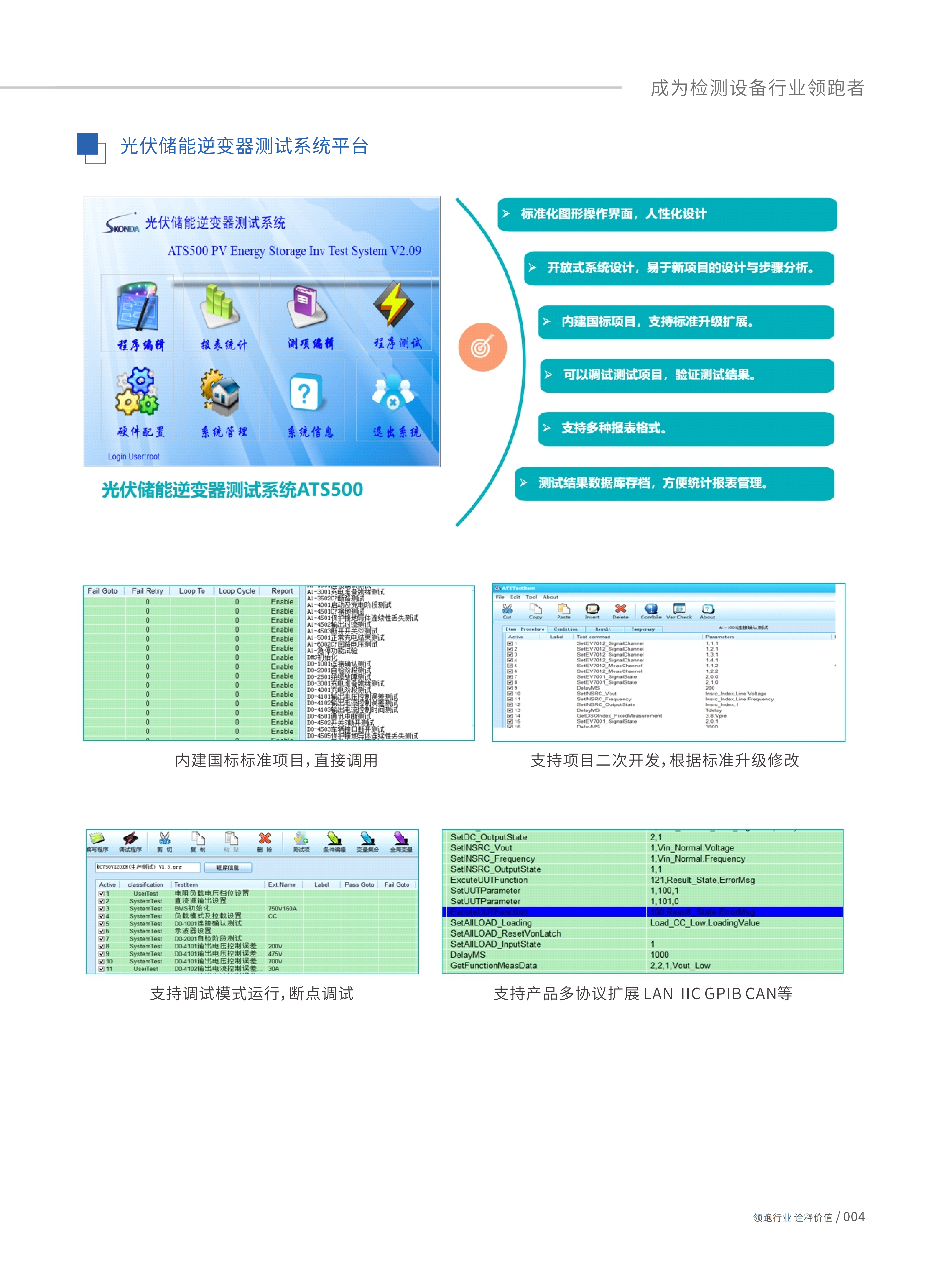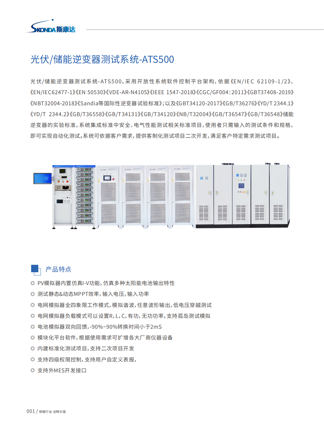 光伏/儲(chǔ)能逆變器測(cè)試系統(tǒng)-ATS500,采用開(kāi)放性系統(tǒng)軟件控制平臺(tái)架構(gòu),依據(jù)《EN/IEC 62109-1 /2》、《EN/IEC62477-1》《EN50530》《VDE-AR-N4105》《IEEE1547-2018》《CGC/GF004:2011》《GBT37408-2019》《NBT32004-2018》《Sandia等國(guó)際性逆變器試驗(yàn)標(biāo)準(zhǔn)》;以及《GBT34120-2017》《GB/T36276》《YD/T2344.1》《YD/T 2344.2》《GB/T36558》《GB/T34131》《GB/T34120》《NB/T32004》《GB/T36547》《GB/T36548》儲(chǔ)能逆變器的實(shí)驗(yàn)標(biāo)準(zhǔn),系統(tǒng)集成標(biāo)準(zhǔn)中安全、電氣性能測(cè)試相關(guān)標(biāo)準(zhǔn)項(xiàng)目,使用者只需輸入的測(cè)試條件和規(guī)格,即可實(shí)現(xiàn)自動(dòng)化測(cè)試。系統(tǒng)可依據(jù)客戶需求,提供客制化測(cè)試項(xiàng)目二次開(kāi)發(fā),滿足客戶特定需求測(cè)試項(xiàng)目。