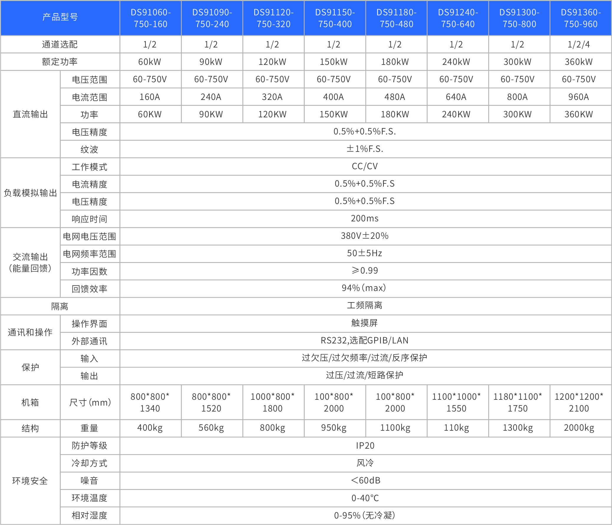 可編程雙向直流電源DS91000系列,是集成直流回饋式負(fù)載和直流源功能的雙向系統(tǒng)。該系列可計(jì)算電壓、電流測(cè)試,有功、無功、功率因數(shù)。