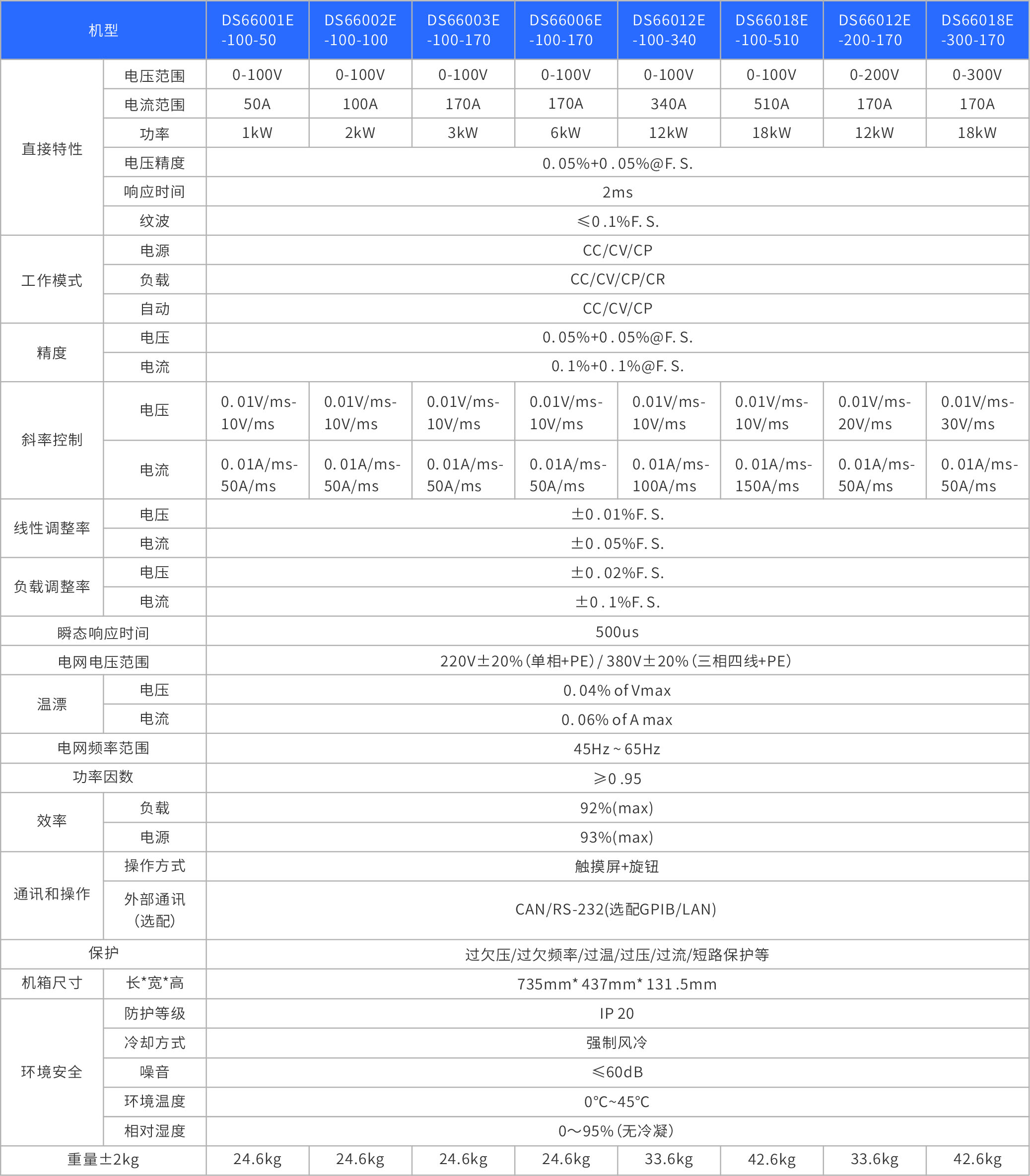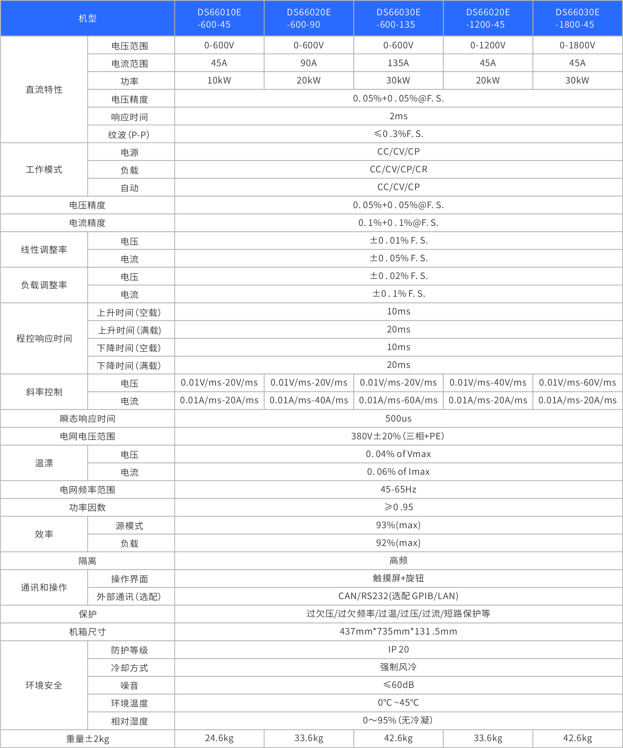 DS66000系列雙向直流電源,是一款兼具電源及回收式負載特性、雙象限操作、可允許待測物能量輸入的電源,該系列可最大限度滿足高壓小電流、低壓大電流等不同產(chǎn)品的測試需求??蛇x擇多種控制方式,支持數(shù)字RS232/LAN/GPIB/CAN通訊接口,是一款功能豐富、性能優(yōu)異、適用廣泛的雙向直流電源。